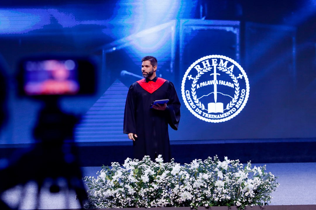 Após a entrada dos 298 alunos, o diretor do Rhema Distrito ministrou uma palavra breve de encorajamento, reconhecendo o avanço espiritual vivido pelos estudantes. Em seguida, todos se colocaram de pé para a execução do Hino Nacional e para o período de música, conduzido pelo Departamento de Música da Igreja Sede.